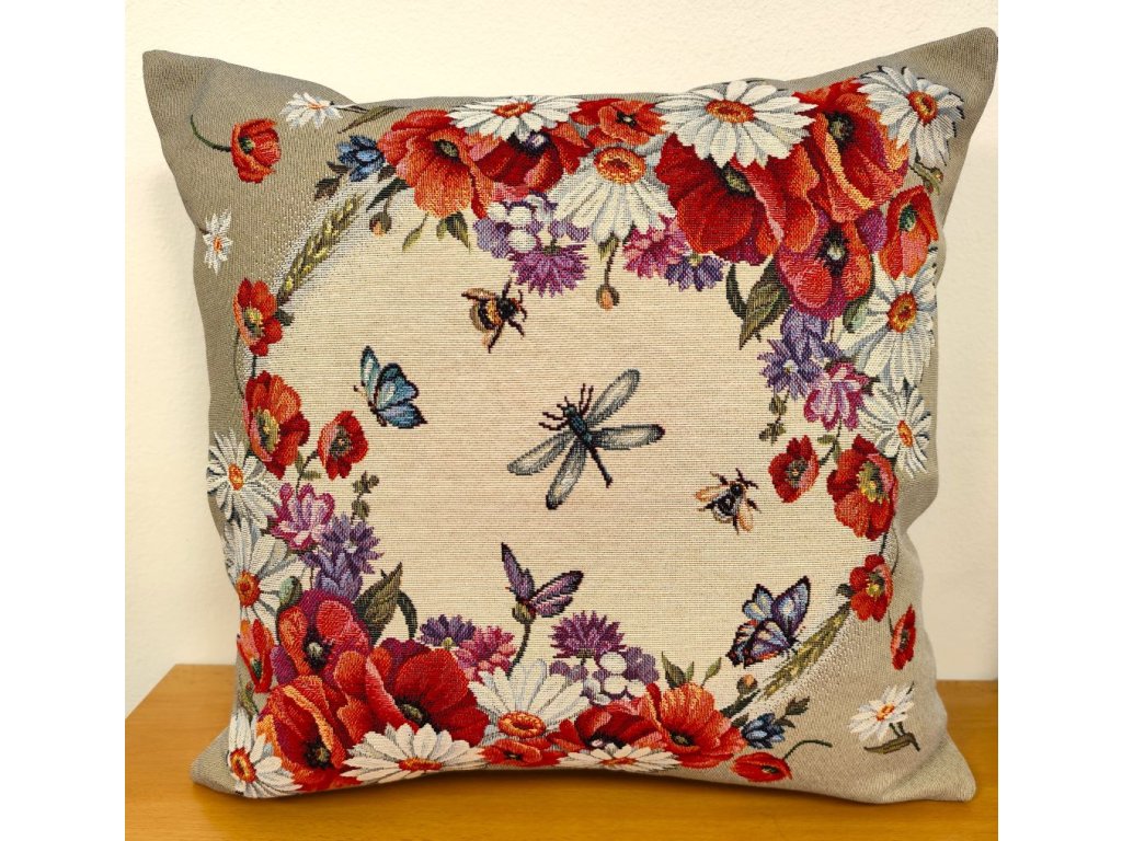 Vyšívaný gobelínový povlak na polštář s výrazným motivem bílých kopretin a rudých vlčích máků..