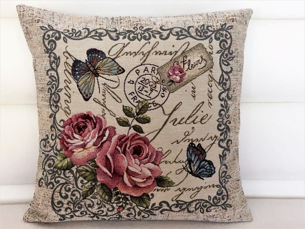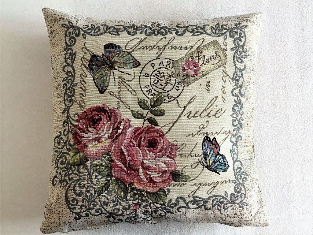 Vyšívaný gobelínový povlak na polštář s roztomilým obrázkem holčičky s růží a motýlkem.