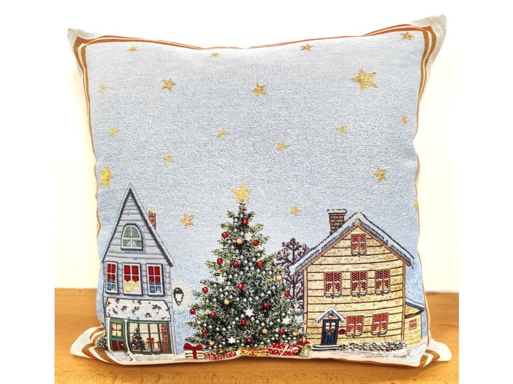 Vánoční povlak na polštář gobelín - Vánoční domky se stromečkem