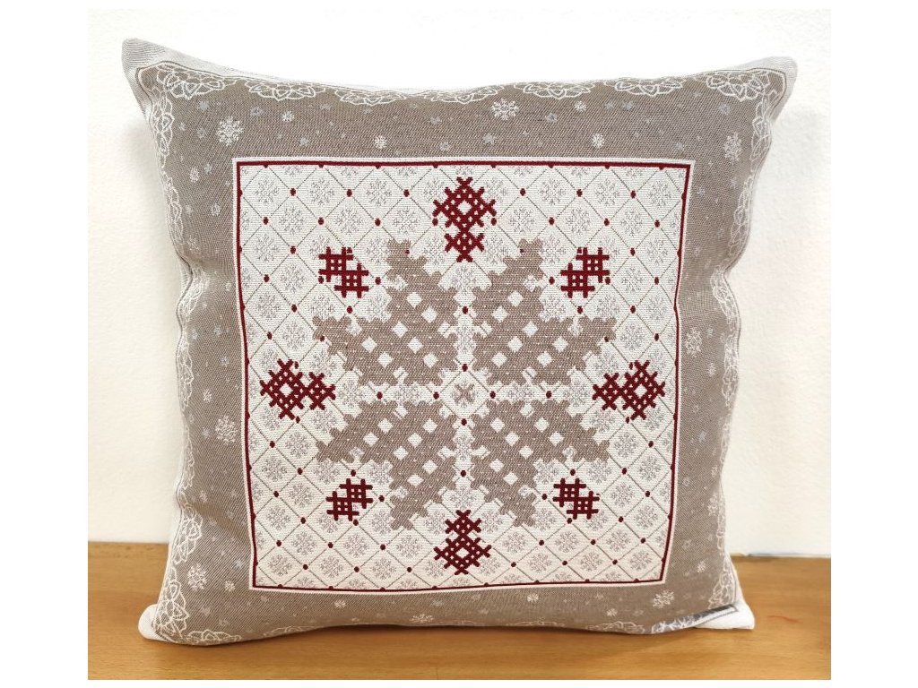 Vyšívaný gobelínový povlak na polštář s klasickým vánočním motivem, protkaný stříbrnou nitkou.
